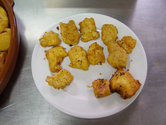 Colocamos en un recipiente con algo de fondo para enfriar y luego poder cortar en trozos cuadrados, rectangulares o como sea, de unos 3-5cm y un espesor de 1-2cm. Estos los rebozaremos en harina y huevos batido para después freírlos en abundante aceite.