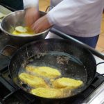Metemos una barra de pan del día anterior en papel film y cortamos rebanadas en lonchas. (El pan conviene envolverlo en el film un día antes). Hervimos la leche con la rama de canela, las cáscaras del limón y la naranja y el azúcar 20 minutos +-. Dejamos enfriar un poco. El pan lo colocaremos en una fuente, echaremos la leche por encima y empaparemos bien por ambos lados. Batimos los huevos pasamos el pan por ellos y freímos en abundante aceite. Colocamos sobre papel de cocina y al servir cubrimos con una mezcla de 3 de azúcar y 1 de canela.
