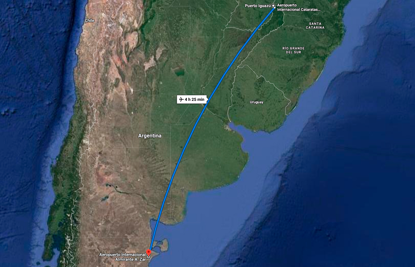 Arriba a las 7:00, tenemos que tomar el vuelo para Trelew a las 9:35 con parada en Buenos Aires.